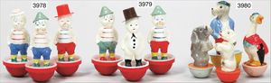 Celluloid, Stehauf-Figuren, 9,5 cm, Mann mit Stock, gem. Germany, ein Celluloid-Junge, anmodellierte Kleidung mit Mütze, 9 cm, 1 Schildkröt-Steifbein-Puppe, 8,5 cm, aufgemalte Kleidung, altersbed. Lackfehler