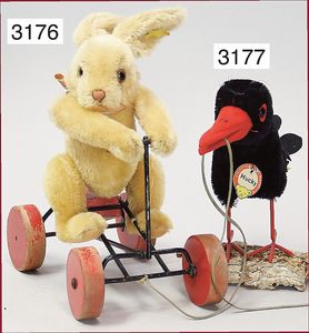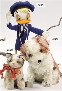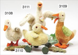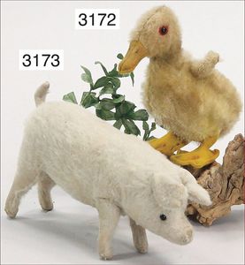 STEIFF Ente, Vorkrieg, mit großem Knopf, langgezogenes F, Mohairplüsch mehrfarbig, stehend, Filzschnabel sowie -beine, filzunterlegte Schnuhknopfaugen, Ausbesserungstellen an den Füßen, Mohair in gutem Zustand, minimale Stelle am Rücken etwas ausgegangen, sonst schöner Orig.-Zust., 22 cm Stehhöhe, ca. 1930