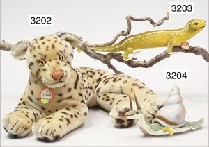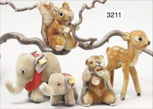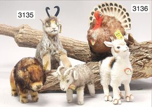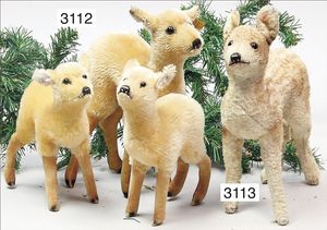 STEIFF 3 Teile, 1x Reh mit Knopf und gelber Fahne, langgezogenes F, Nr. 6332.0, Stehhöhe 25 cm, sehr guter Zust., 2 Rehe 19 cm, 1x mit Knopf und langgezogenes F, schönes Konv.