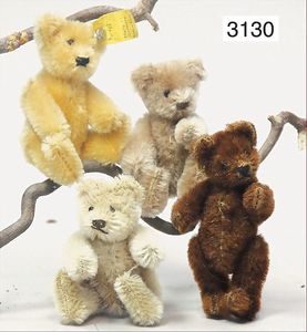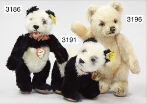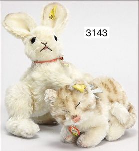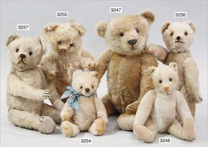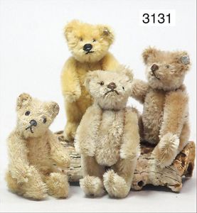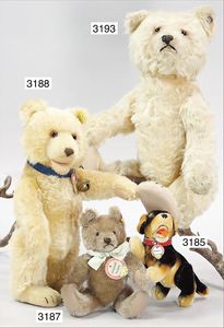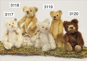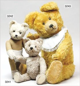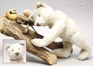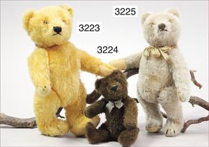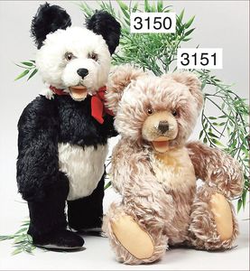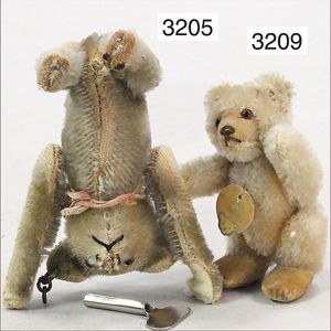 STEIFF 2 abgeliebte Vorkriegsbären, 1x weiß, deutlicher Buckel, Schuhknopfaugen, helle Nasenbestickung, Mohairverlust, 10 cm, dazu 1x karamellfarben, Schuhknopfaugen, schwarze Nasenbestickung, mit Knopf, langgezogenes F, an vereinzelten Stellen etwas Mohairverlust, sehr schönes Konv., toller Ausdruck