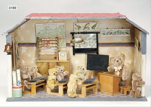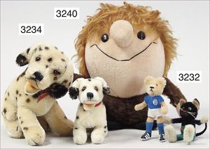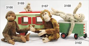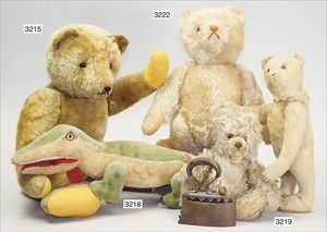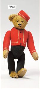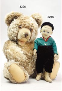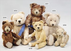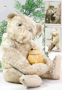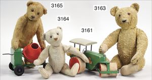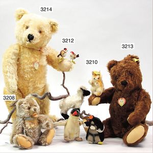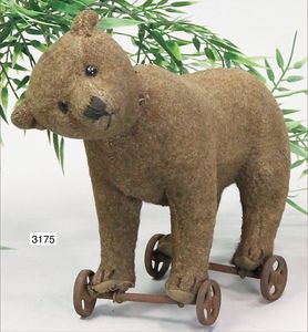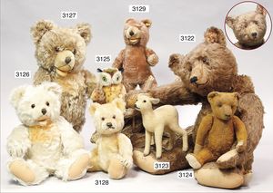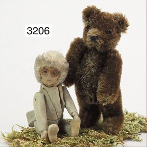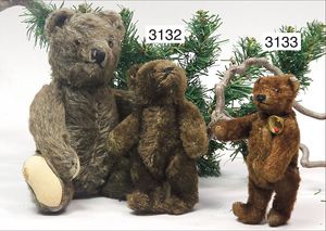 STEIFF ausgefallenes Teil der Steiff-Produktion, Bär, Vorkrieg, langgezogenes F, Glasaugen, dunkelbraunes Mohair, deutlicher Buckel, lange abgeknickte Arme, lange Nasenspitze, berieben, an vereinzelten Stellen etwas ausgeblichen sowie ausgegangen (abgeliebt), kleinere Mottenlöcher in den Filztatzen sowie eine kleine Flickstelle, 67 cm, sonst schöner Orig.-Zust.