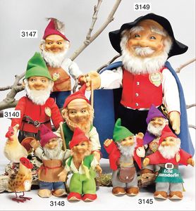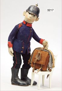 Schürzenschläger, 37 cm, Biskuitkopf, fest eingesetzte braune Glasaugen, offener Mund, Holzdrahtkörper