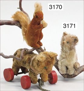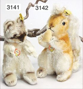 STEIFF 2 Teile Eichhörnchen, 1x Vorkrieg, mit Knopf, langgezogenes F, Mohairplüsch, rot/braun/weiß, aufwartend, mit Samtnuss, 20 cm, ca. 1935, guter Zustand, dazu 1x Samt, Schwanz Mohairplüsch, rot/braun, aufwartend, Nuss fehlt, 10 cm, ca. 1934, schönes Konv.