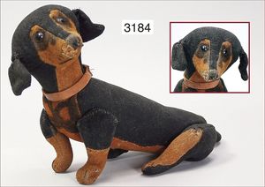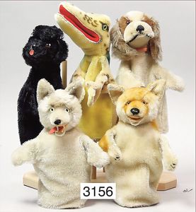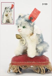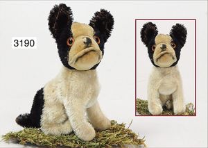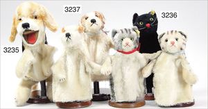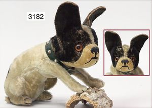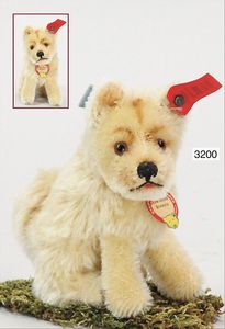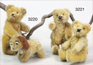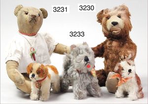 STEIFF Konv. Vorkrieg, Spitz mit Knopf, langgezogenes F, Langhaar-Mohair, etwas vergilbt, Stehhöhe 17 cm, leicht abgeliebt, mit Lederhalsband, dazu ein Treff mit Knopf, langgezogenes F, sitzend, drehbarer Kopf, 10 cm, sehr schöner Ausdruck
