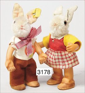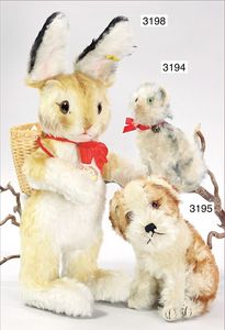 STEIFF Pupp-Hase, Vorkrieg, mit Knopf, langgezogenes F, Mohairkopf, Stoffkörper in gutem Zustand, Filz, Tracht, Stehhöhe 27 cm, ca. 1935, Körper ein wenig verstaubt, sonst schöner Orig.-Zust.