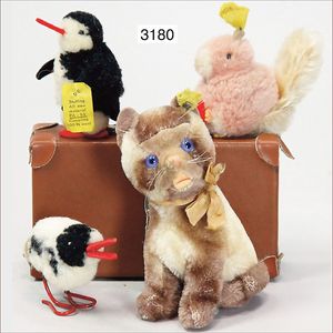 STEIFF Gans, mit Knopf, Brustschild und gelber Fahne, Nr. nicht ganz lesbar, weit ausgespannte Flügel, bemaltes Mohair, Filzfüße und -schnabel in sehr gutem Zust., filzunterlegte blaue Glasaugen, 27 cm