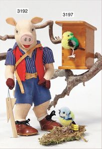 STEIFF Wittie, Eule, mit Knopf, Schild und Fahne, Nr. 4314, leicht grünliche Färbung im Mohair deutlich erkennbar, unberührter Orig.-Zust., 13 cm