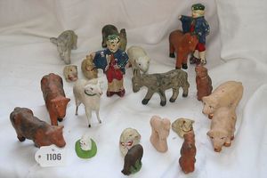 2x Erzgebirge Karrussel, bespielt, Höhe 6,5 und 9 cm, Pappmaché-Pferd auf Holzrädern, einige Hühner und Gänse, Zinnfiguren, handbemalt, neu und Konv. Miniaturwerkzeug für eine Schreinerei, neuer