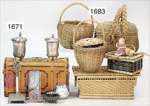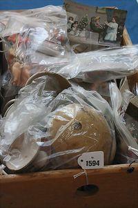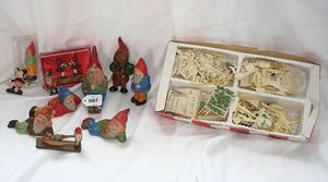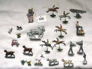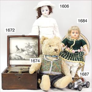 Fundkiste, u.a. ca. 40 Margarine-Figuren, einige frühe Murmeln, kleine Registrierkasse, das Spiel "Fang den Hut", "Irrgarten", "Gloria", "Mosaik", Tippkick, ein Holzziehspiel, Traffokleinteile