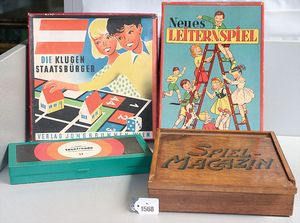 Konv. 4 Spiele, 1x Neues Leiterspiel, Die Klugen Staatsbürger, Verlag Jungbrunnen Wien, 1 Spielemagazin in Holzkiste und Lesefreude Schülerlesekasten