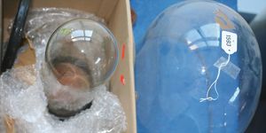 Wachsfigur, alte Dame, Krämersfrau, mit Näh-Utensilien, ca. 26 cm, unter einem Glassturz (Glas geklebt)