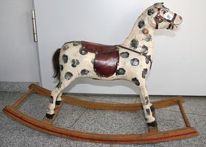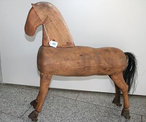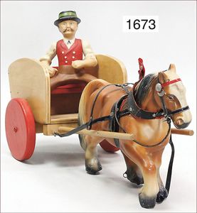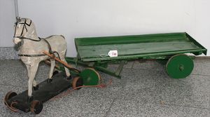 Fuhrwerk, Holz, Pferd, auf Holzrädern, Länge 35 cm, altersbedingte Lackabplatzer, dazu Anhänger, Länge 52 cm
