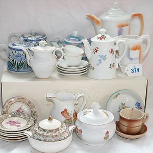Kinder-Speiseservice, um 1900, Motiv Max und Moritz, 6 flache und tiefe Teller, Durchm. 11 cm, Suppenschüssel, Sauciere, 2 Anbieteschalen, 1 Deckelschale, Orig.-Kart., mit zeitgenössischem Deckbild, ausgefallen