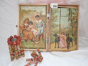 Würfel-Legespiel, Holzkiste mit bunt lithogr. Deckblatt, 24x15,5 cm, dazu 2 Kegelspiele um 1900