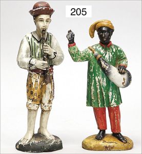 2 holzgeschnitzte Figuren, 1x Mohr, Finger der re. Hand weggebrochen, 23 cm, 1x Flötenspieler, 27 cm, altersbed. Farbabplatzer