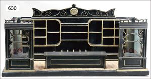 Konditorei, Holz, Länge 75 cm, Tiefe 33 cm, Höhe 29 cm, an einigen Stellen restauriert, fest eingesetzte Regale, 2 Schaufenster, verglast, mit Theke