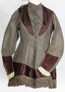 Damenkleid, ca. 1820, 2-tlg., Taft und Seide, mokka und bordeauxrot, leichte Keulenarme, kleiner Stehkragen, Knopfreihe vorne, sowie an den Ärmeln, Spitze an den Ärmelenden, stark tailliert, alte Hakenverschlüsse, Fransenborde, dazu feiner Unterrock, nur teilw. mit Seide verarbeitet, schön gerafft, wunderschöner Orig.-Zust.