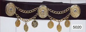 70er Jahre, Hüftgürtel, 1x Francois Jacquin, Gr. 75/30, mit Münzen-Muster, dazu prächtiger Ledergürtel, Gr. verstellbar, 1 Ledergürtel mit goldenem Kettenmotiv, Gr. 85, ausgefallen