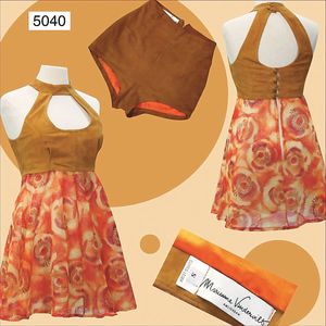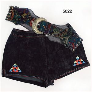60er Jahre Hotpants, samt, mit buntem Emblem, breiter Rock, teilw. Kettenmuster, Gr. 38, ausgefallen