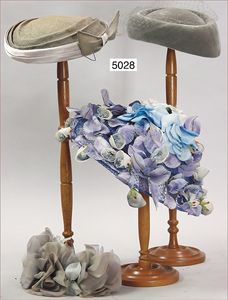 Konv. Damenhüte, 50er Jahre, 1 ausgefallener Damenhut mit prachtvollen Stoffblumen, blau/flieder, Label Gigi New York; dazu 1 flacher Damenhut mit Label Franck Fitz Paris; 1 Haarschmuck (Kranz), mit integrierter Haarklammer und Stoffblumenbesatz, schönes Konv.
