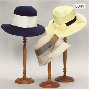 3 Damenhüte, 80er Jahre, 1 cremefarbener Damenhut mit Goldbrosche an der Frontseite, 1 marineblauer Filzhut, 1 cremefarbener Stoffhut mit schwarzem Seidenband, gemarkt Gerdi Oss Friedrichshafen