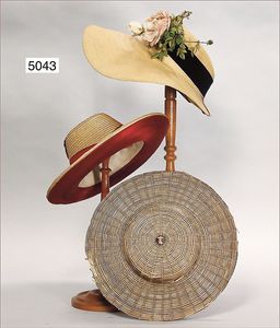 Damenhut, ca. 1910, mit altem Hutständer (Holz), geflochten mit blauem Samteinsatz, ausgefallen