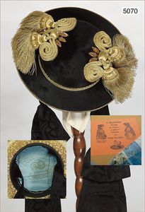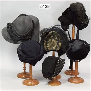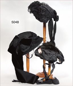 Konv. Damenhüte, Jahrhundertwende, schwarze prachtvoll geflochtene Damenhaube, mit Federschmuck und Kreppband, 1 Haube, schwarz mit Paillettenbestickung u. Spitze, 1 Damenhut mit Samtband bestickt, schöner Orig.-Zust.,