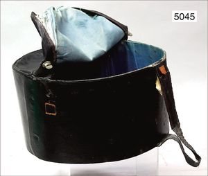 alte Hutschachtel, Leder, seitl. 3 Drehverschlüsse, innen blaufarbenes Innenfutter, etwas verblichen, abgenutzt, 35 cm Durchmesser