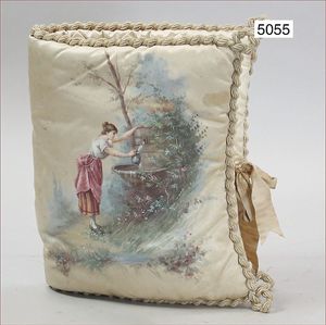 Taschentuchbehälter, um 1910, Seide, feines gemaltes Frauenmotiv am Brunnen, gefüttert, mit Seidenschleife, ummantelt mit Kordel, cremefarben, Seide in schönem Orig.-Zust.