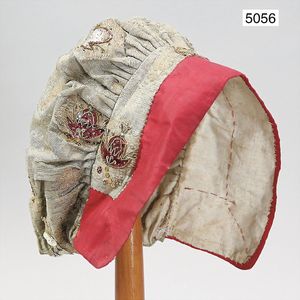 ausgefallene Damenhaube, um 1800, Baumwolle u. bordeauxfarbene Seide, ausgefallene Silberapplikationen, Paillettenmuster, schöne Verarbeitung, schöner Orig.-Zust.