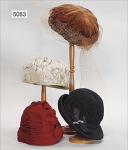 Konv. Damenhüte, 50er Jahre, 1 hochwertig gearbeiteter schwarzer Damenhut, Samt, Made in France, Ellys James, seitl. 2 Haarkämme zur Befestigung, 1 strohgeflochtener Damenhut mit Reiherferdern beschmückt, 1 Damenhut bordeaux/cremefarben, Ori.-Gage Label, 1 ausgefallen gearbeiteter Damenhut, bestickt mit kl. Perlen, gemarkt Dinels Longbeach; 1 Haarschmuck für Dutt