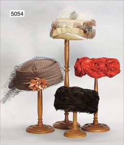 Konv. Damenhüte, 60er Jahre, 1 zartroséfarbener Damenhut, flach, mit transparentem Haarschmuck, 1 dunkelbrauner Damenhut mit Federschmuck, Label Martha Stramm Berlin Kurfürstendamm 237, 1 Damenhut schwarz, 1 roter Stoffhut, schönes Konv.