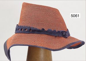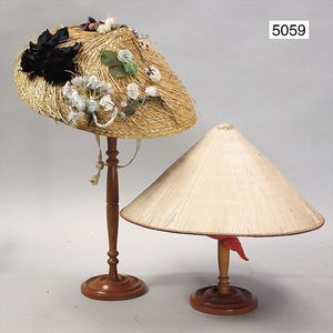 2 Strohhüte, 50er Jahre, 1x mit reichl. Blumenschmuck, Durchm. 41 cm, ausgefallen gearbeitet, 1x zylinderförmiger geflochtener Damenhut, innen mit Tuch zum Befestigen, 41 cm Durchm., sehr schöner Orig.-Zust.