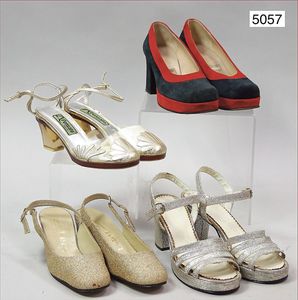 Konv. Sixties Damenschuhe, 1x Sandaletten, breiter hoher Absatz, silber/gold schimmernd, Gr. 4 1/2, dazu 1 Paar von Bon Dor, Made in Italy, Gr. 36, mit Plateau, weiches Wildleder, dunkelblau/rot, guter Zust., dazu 1 Paar Typ. 60er Jahre Damen-Sandaletten, Kunststoffabsatz, außergewöhnlich, Made in Italy, Gr. 7, Hersteller Pensatom, Transparent mit Goldapplikationen, ausgefallen, dazu 1 Paar Damen-Pumps Werner Kern Hautecoture, Gr. 3 1/2, goldfarben, schönes Konv., ausgefallen