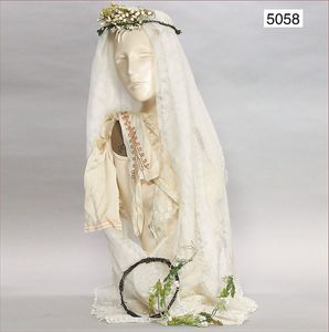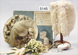 ausgefallenes Biedermeier Konv., in Pappschachtel Aufschrift: Paris 16, Rue des Trairies envoi de M. Alfred Francois, gestempelt 1891, dazu Papierblumenstrauß mit Wachsblüten, 31 cm, 1 ausgefallene Seidenhaube, reichhaltig gerüscht, Blumenranken, leicht rosé, sehr schöner Orig.-Zust., dazu Muschel-Portemonnaie, Verschluss leider defekt, 3 Füllfächer, 1 Christbaumkugel Glas, in Form eines Schuhs, 1 Hut (wohl für Kinder, auch geeignet für größere Puppen), flache Form, mit Blumen- und Federdekor, schönes Konv., bitte besichtigen