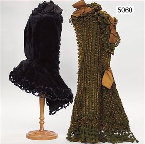 Damen-Kopfbedeckung (Chenille) um 1890, 2 Teile, 1x braun, gehäkelt mit Seidenschleifen, 1x schwarzer Samt mit Seidenschleifen, teilw. verschlissen, schöner Orig.-Zust.