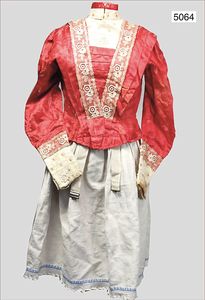 Damenjacke, ca. 1910, rosafarbene Seide, Samt mit leichtem floralem Muster, teilw. Seide an vereinzelten Stellen altersbedingt verschlissen, feine Spitze an den Ärmelenden, sowie auf der Brust, mit Haken und Druckknöpfen, innen mit Verstärkungsstäben, kl. Stehkragen, dazu Damenrock, wohl 1890, Leinen, mit blau/weißer Borte am Rockende, guter Zust., 61 cm lang, schönes Konv., bitte besichtigen