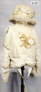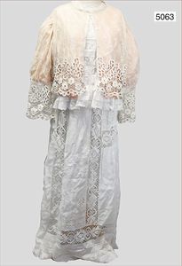 19. Jahrhundert, weiße Spitzenwäsche, feine weiße Blusen, 1 Damenjacke, innen apricotfarbene Seide, außen feine Spitze, lang abgenähte Arme, ausgefallen,1 weißes Damenkleid, Spitzenbesatz, ausgefallen, 1 Bluse, nicht passend, ca. Gr. 36/38; 1 weiße Haube, schönes Konv., bitte besichtigen