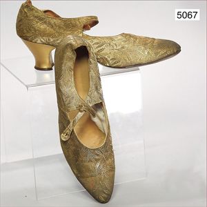 Damenschuhe, Alter?, 29 cm lang, goldener Stoff, florales Muster, 6 cm Absatz, gestempelt 8D 21051, Riemchen mit Knopf, genagelter Absatz, gem. 8B