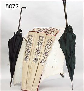 Konv. 3 Flanierschirme im Aufbewahrungssack, bestickt, "Ordnungssinn bringt Gewinn", 1x eierschalenfarbener Flanierschirm, Holzgriff fein verarbeitet, Ende mit Silberfußarbeit, 98 cm, 1 Flanierschirm, schwarze Seide, florales Muster, Holzgriff, Ende leicht gebogen, fein ausgearbeitet, Seide an minimalen Stellen etwas altersbedingt berieben (wurde nicht aufgespannt), dazu 1 Flanierschirm, dunkelgrüne Seide, breiter Holzgriff, schöner Zust., wohl jünger