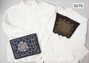 Konv. Weißwäsche, 2 schmale Damenblusen, dazu 1 Stofftasche, bestickt mit Perlenarbeit, dunkelblauer Druckknopf vorne, innen Kunstseide, seitl. 2 Seitentaschen, 20 cm breit, 14 cm hoch, dunkelblau, dazu 1 Taschentuch wohl jünger, mit Strasssteinbesatz, 3 gr. Steine fehlen, 20 cm x 15 cm