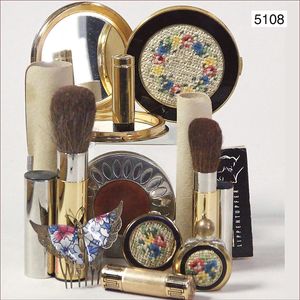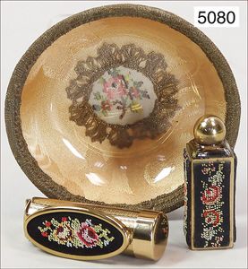Konv. Damen-Kosmetikaccessoires, 1 Parfümflakon mit ummantelter Petit Point Arbeit, 6 cm, innen mit Flüssigkeit, dazu passend Lippenstiftflakon mit integriertem Spiegel u. passender Petit Point Arbeit