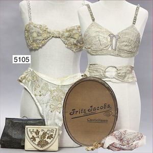 ausgefallenes Konv., wohl 30er Jahre, Burlesque Damenunterwäsche (Reizwäsche), Perlen bestickter Schlüpfer, mit nachträglich angenähten Druckknöpfen und Plastik-Reißverschluss, dazu passend Oberteil (BH) mit altem Druckknopf, ebenfalls Pailletten bestickt, mittig frei ausgeschnitten für Brustwarze, getragen, dazu 1 transparenter altrosé Schal, Perlen bestickt, florales Muster, dazu 2 ausgefallene BH-Oberteile mit Strasssteinen, 2 alte Portemonnaies, 1x beige mit dazugehörigem Geldbeutel an Metallkette, 1 Ledertasche, innen Kunstseide mit orig. Spiegel, 14 cm x 22 cm, ausgefallen, bitte besichtigen, in altem Kart. "Fritz Castellaun"