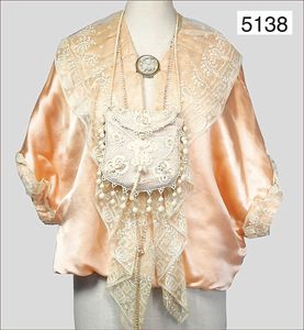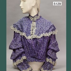 Damenbluse, ca. 1910, innen mit Streben für die Taille, aufgeraffte Keulenärmel, alte Perlhaken, feine fliederfarbene Seide, mit indischen Ornamenten, ausgefallen, kl. Stehkragen