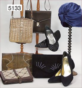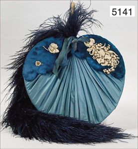 Konv., ca. 1910, schwarzer geflochtener Hut (Taufe), 3-teiliger Straußenfeder-Schmuck in schwarz und kupferrot, Stoffblumenbesatz, Haarnadelschmuck, Kopfdurchm. 13 cm, dazu 1 ausgefallene Damentasche mit schwarzen Straußenfedern und Stoffblumendekor, 1 Kettentrageriemen, Druckknopfverschluss, Innenfutter Seide, 18 x 21 cm, dazu passend 1 Federfächer, wohl Pfauenfedern, teilw. Federverlust, 35 cm lang