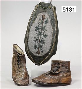 ausgefallenes Konv., 1x ca. 19. Jhd. oder älter, Damen Tasche, oval, Leder mit ausgefallenem floralem Perlenmuster, an Front sowie Hinterseite (grasgrünes Leder), Innenfutter Wildleder, 22 cm hoch, dazu 1 Paar Leder-Kinderschuhe, seitl. mit einer Knopfreihe (5 Knöpfen), innen Leder, 13 cm, auch geeignet für gr. Puppe