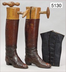 alte Lederstiefel mit Holzstiefelspanner, genagelte Absätze, ca. Gr. 39, evtl. Reitstiefel, ausgefallen, guter Zust., 1x Kinder Gamaschen, seitl. Knopfreihe, innen gem. 7228428, Innenfutter Baumwolle, ausgefallen, guter Zust.