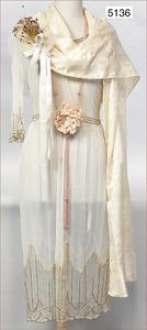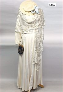 Damenkleid, ca. 1920, eierschalfarbene Seide, Knopfreihe hinten, sowie an der Taille, Stehkragen, lange Ärmel, bodenlang, 134 cm lang, 35 cm Durchm. der Taille, dazu passender Seidengürtel, feiner Schal, transparent, 240 cm lang, mit feiner Silberarbeit, dazu ausgefallene Damentasche, dunkelblaue Seide, verschlissen, Stoff Innenfutter, dazu 1 geflochtener Hut, mit Stoffblumenbesatz und feiner Haarnadel, sehr schöner Orig.-Zust.