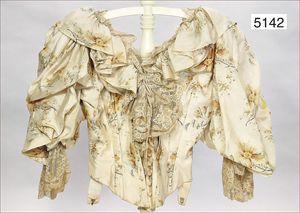 wohl Rokoko, herrschaftl. Damenbluse, Seide, florales Muster, gefaltete Keulenärmel, am Ärmelende mit feiner Spitze, innen Fischgräten-Verstärkung, an der Rückenseite Perlmutt-Knopfreihe und alte Hakenverschlüsse, aufwendig gearbeitet, 20 cm Durchm., Schulterbreite 38 cm, sehr schöner Orig.-Zust., fein gearbeitet