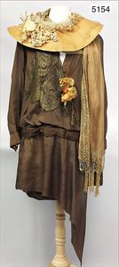 30er Jahre, dunkelbraunes Damenkleid, dazu passende geflochtene Haube, reichlich Blumenbesatz, mittig offen, breit geschnitten, ca. 38, dazu passend transparenter Schal mit Spitzenstickereien